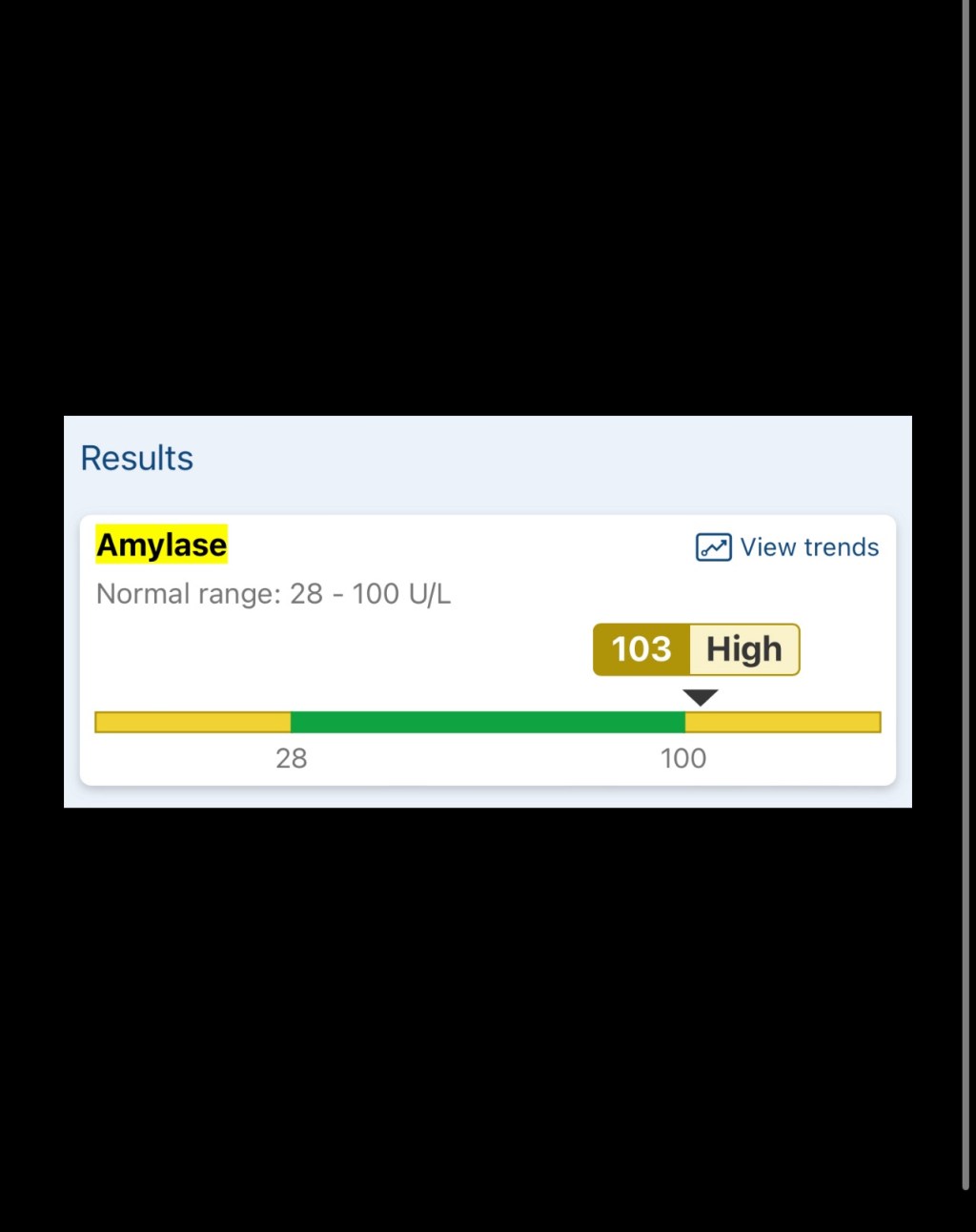 When the lab results came in, I took the time to go through each one carefully. I was able to note the key markers and any areas that seemed out of range. I noticed that some of my lab values were abnormal. One that stood out was the amylase level. The normal range is 28-100 units per liter (U/L). This level jumped from 69 U/L to 103 U/L. Amylase is an enzyme produced primarily by the pancreas and the salivary glands, and it plays a crucial role in the digestion of carbohydrates. The range of amylase levels in your blood can provide valuable information about your pancreatic health and potential underlying conditions. Here’s what the amylase range can indicate: